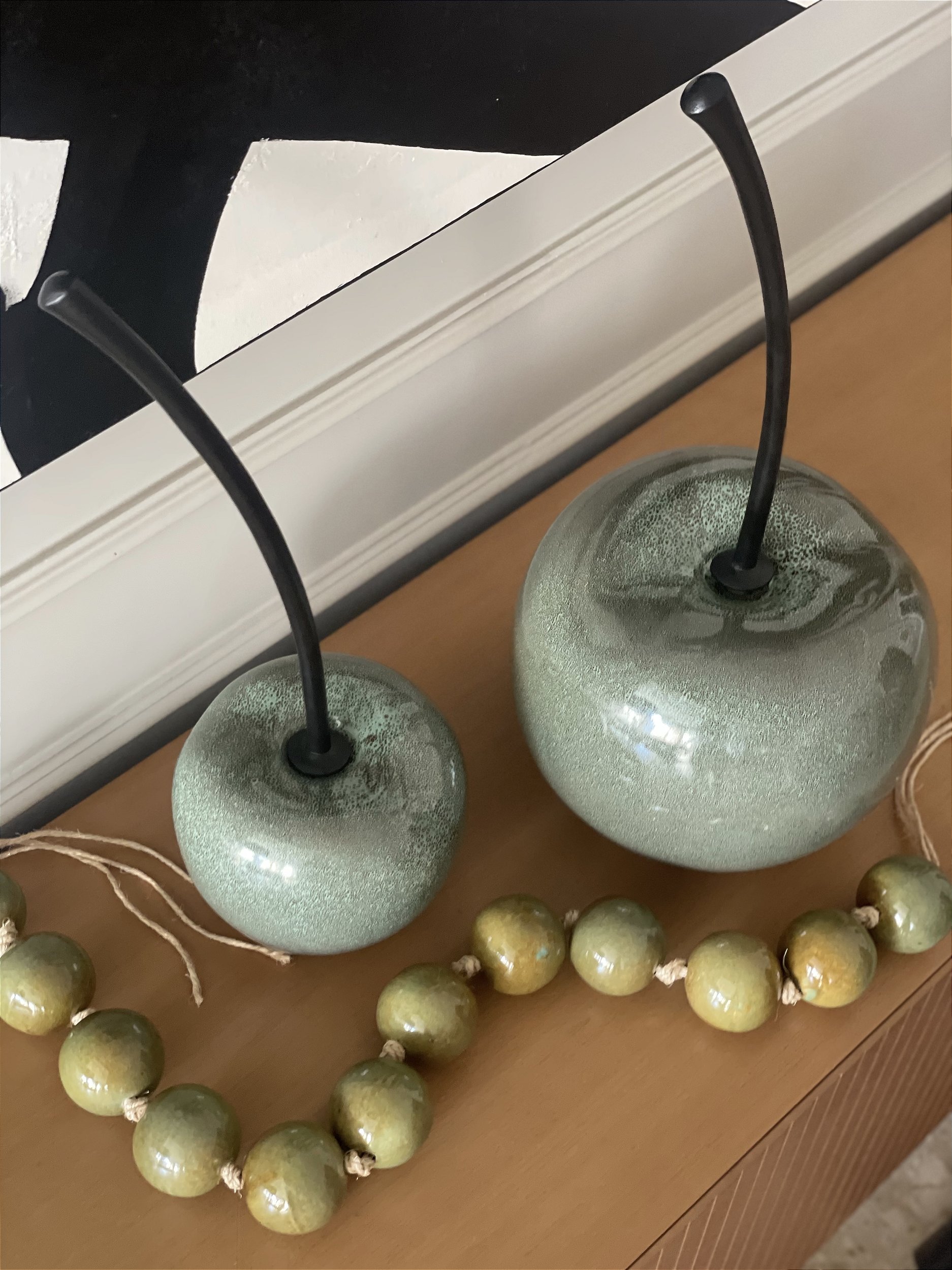 Peça decorativa em cerâmica pintada com efeito texturizado verde, toque liso e acabamento brilhante. Tem cabo removível preto acetinado. Ideal para decorar ambientes e mesas.