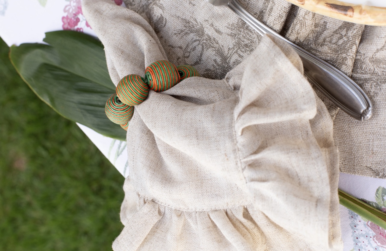 Guardanapo quadrado em linho misto com borda em babado franzido.