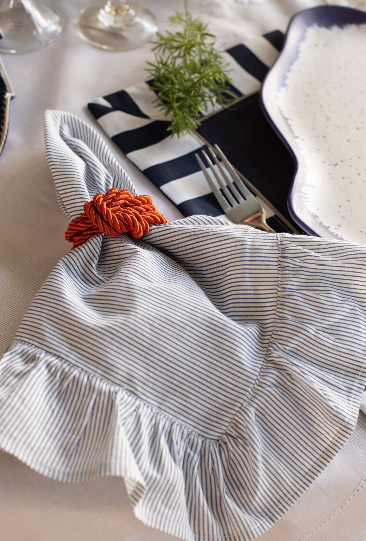 Guardanapo em tricoline listrada com bordas em babado franzido.